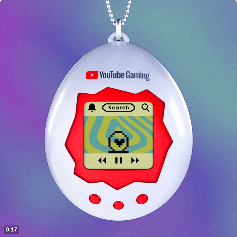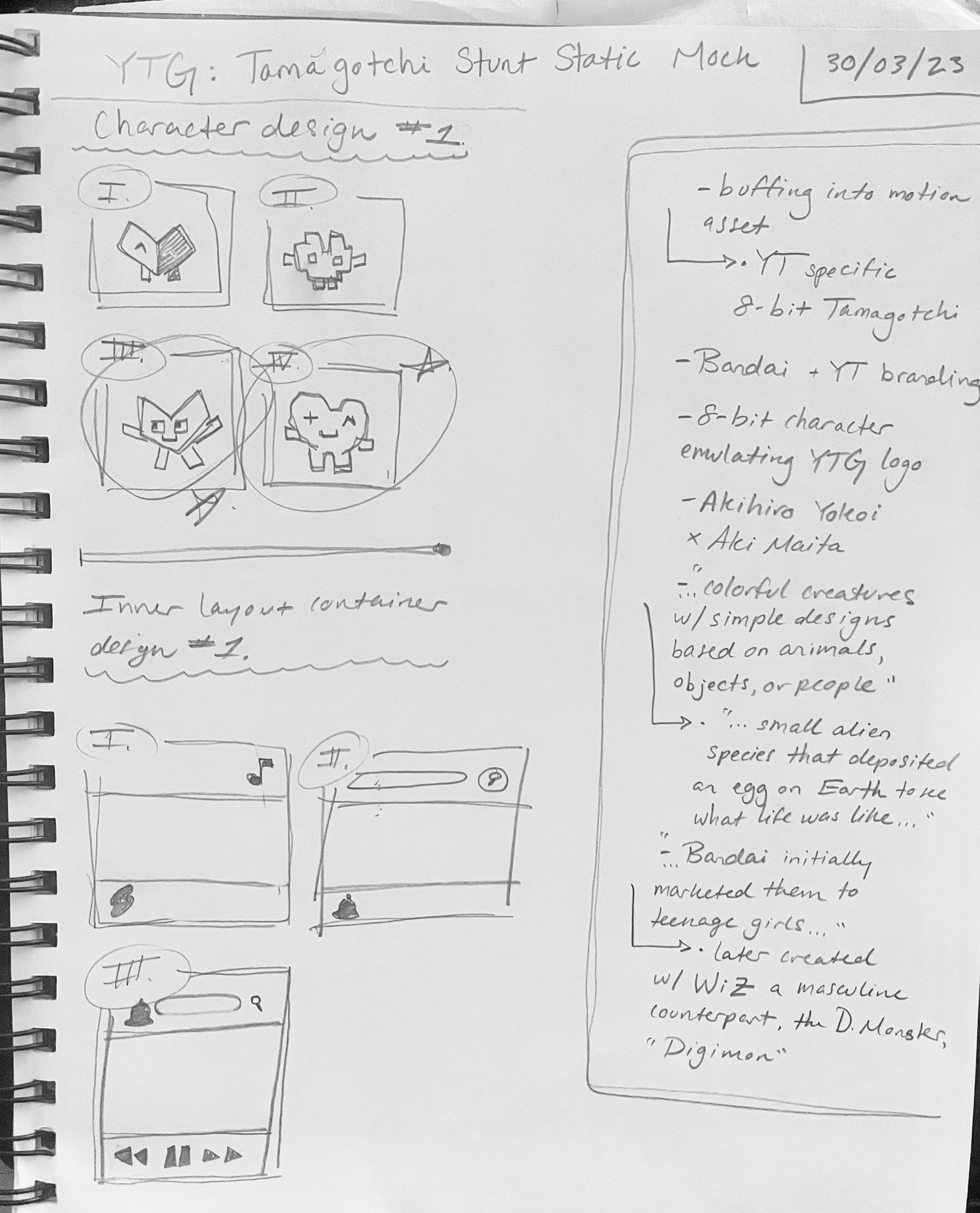 A character design made for YouTube Gaming. The prompt was asking me to take the YouTube Gaming logo and turn it into a Tamagotchi-themed character sprite, similar to the ones Bandai has made for its own product. In this process, I worked with one of our senior animators on our YouTube team, Nick S., and our main motion graphic designer, Reshma, on the YouTube Gaming side. I also spoke with our social media coordinators to receive feedback in narrowing down the design of the character art, too.