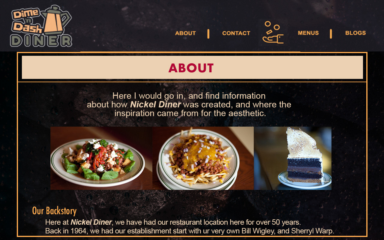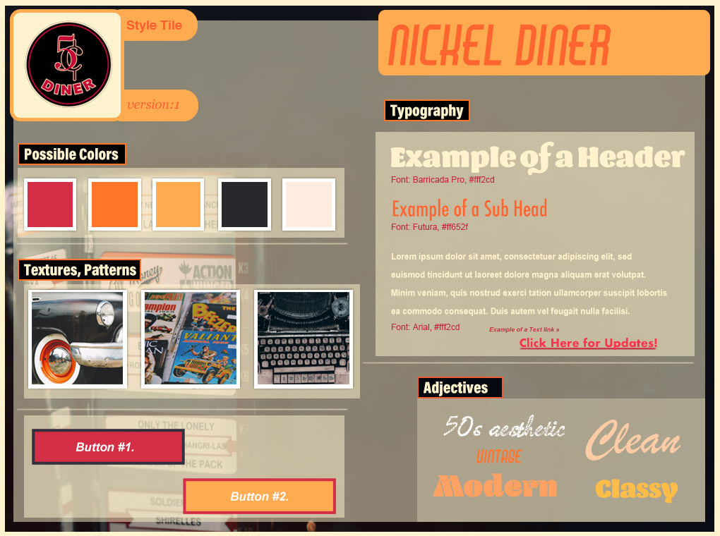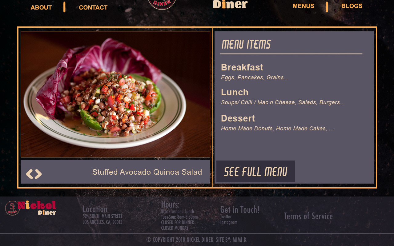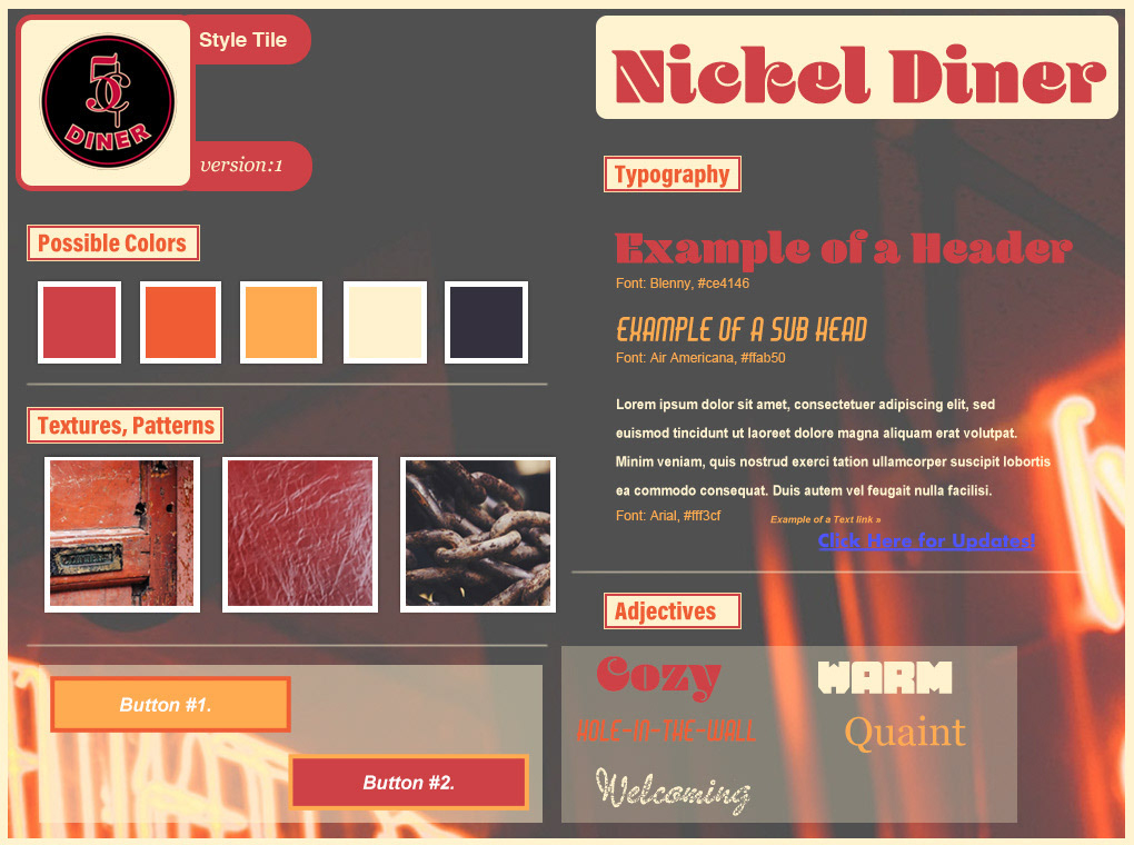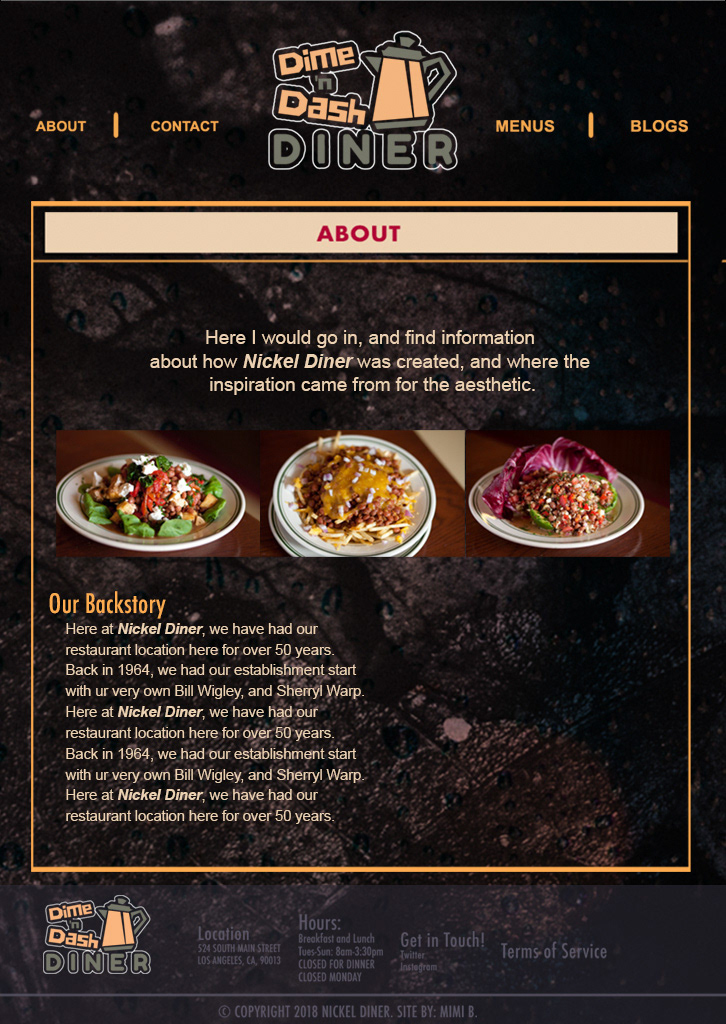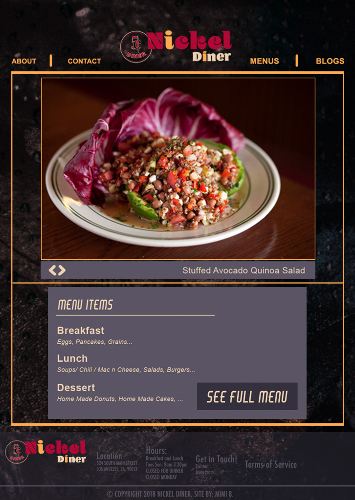 Based on a diner located in downtown LA known as "The Nickel Diner," this was to be a web design project for my Web Design II class. The moodboard designs were loosely based on the 1974 movie, "The Front Page," downtown LA nightlife, and the 1950s diner-era. I enjoyed when our professor told us to get as detailed as we wanted to, to make it our own website, as if we were to be commissioned to design one for a small business. My favorite part of this process was the wire framing: so intricate, and sparked my curiosity with looking more into grid design and layouts.