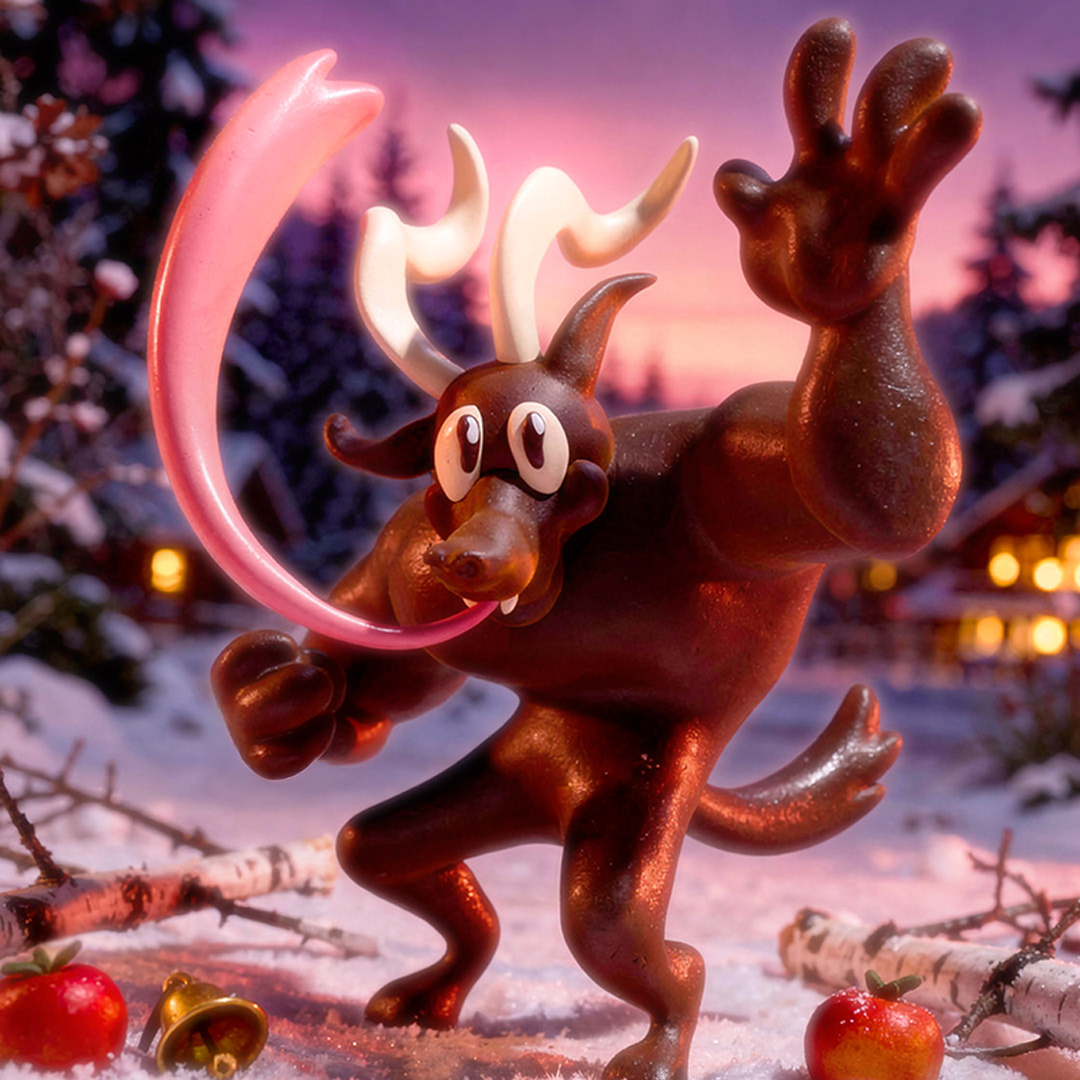 A playful 3D cartoon Krampus turned into a Pokémon-style collectible card and month-long merch item for The Realm Co.’s KRAMPUS ballet.