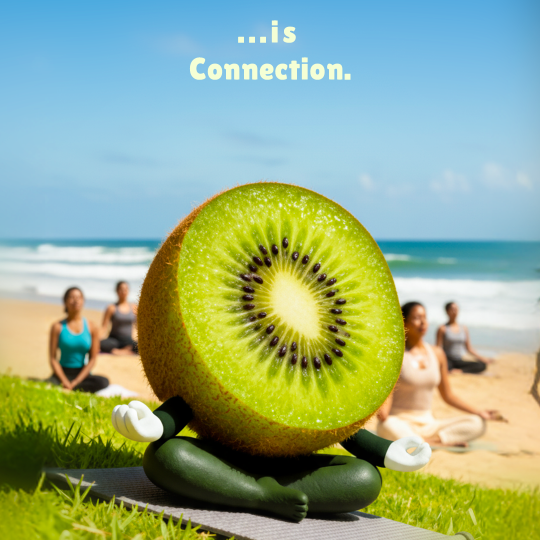 A playful, photo-realistic kiwi fruit mascot designed to embody community vitality and answer "WTF is Kiiwi?" through tangible, relatable scenarios.