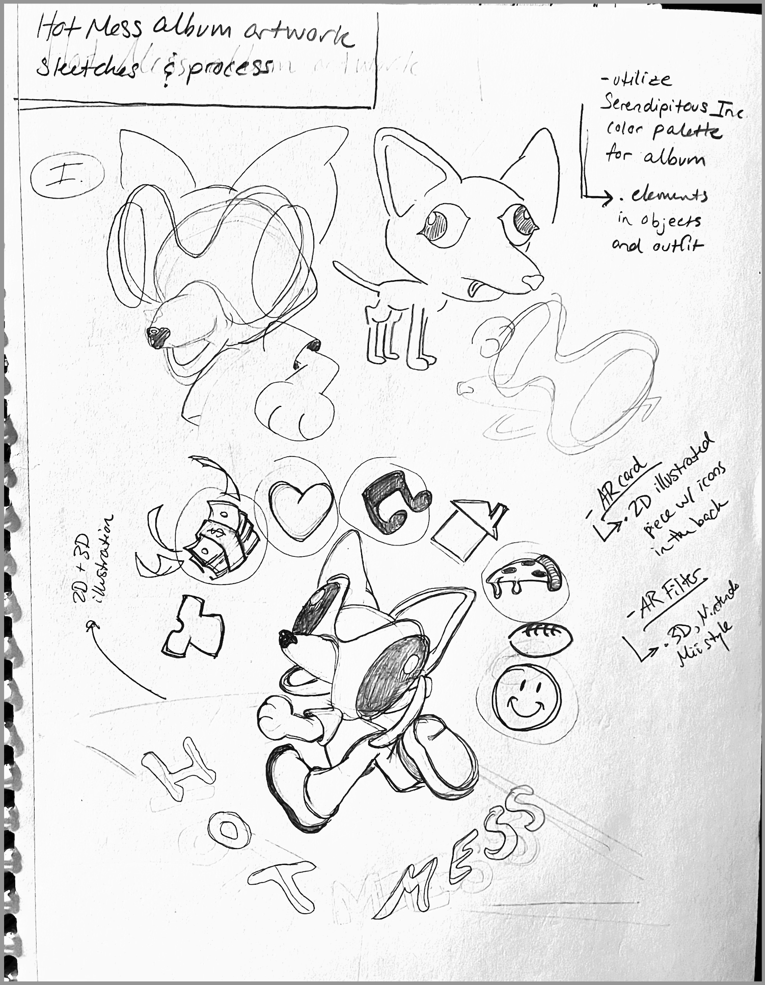 As an illustrator and designer for JayyR's album, "Hot Mess," I created cover art centered around Happy the Chihuahua, a persona that embodies the artist's journey. I started with developing a 3D model of the character, which I then refined through illustration, capturing both Jay's professional and personal growth. Happy serves as a unifying element for the album release and Serendipitous Corp.'s radio show redesign.