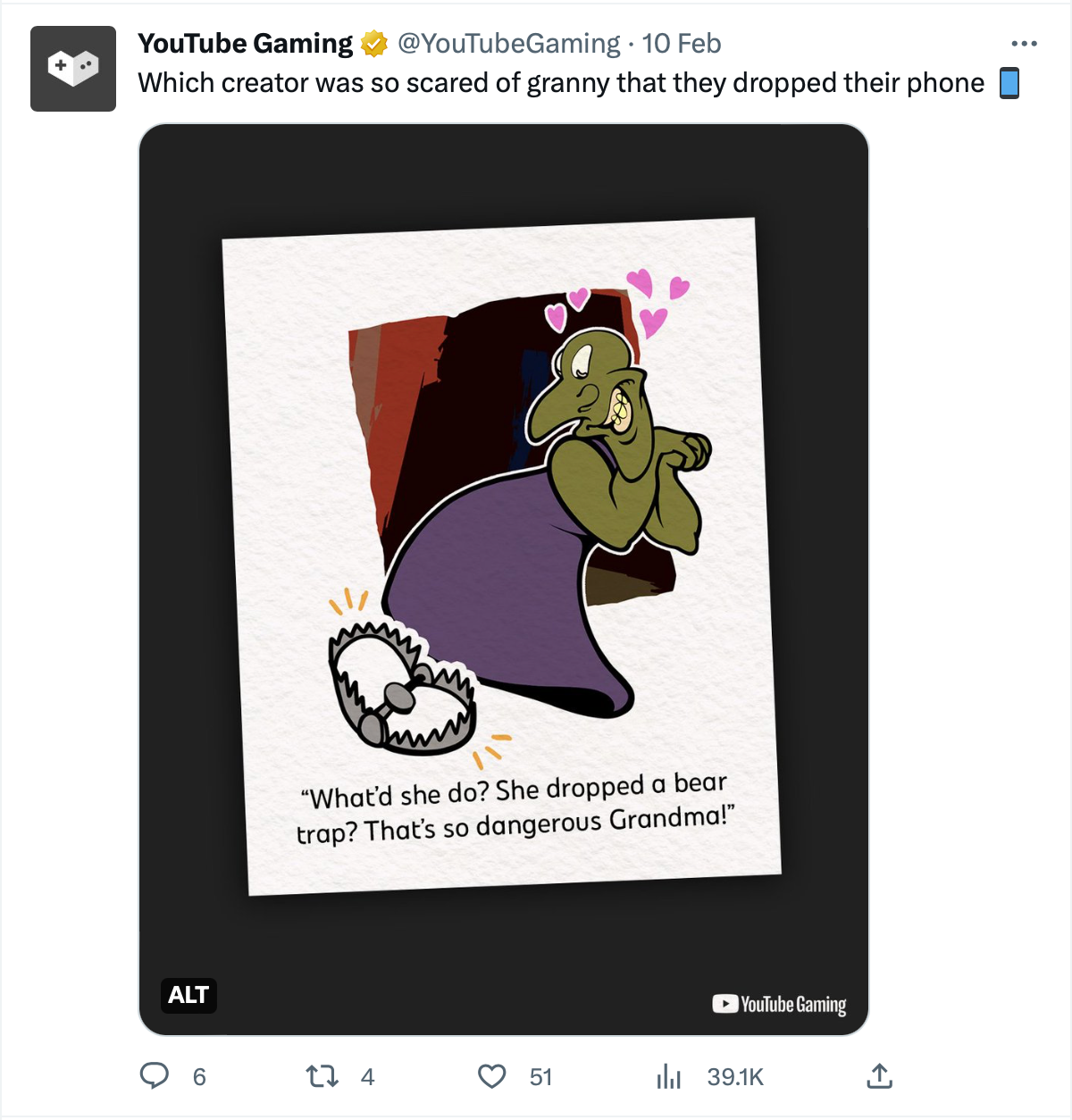 A small illustration for our YouTube Gaming team. Our coordinators requested that I draw an interpretation of a quote made by LaurenZSide, in reaction to her playing the 2017 horror-survival game titled, "Granny". I had a lot of fun working on this drawing. I study caricatures in my spare time, and I'm happy that I got to use my studies in the application of this cartoon.
