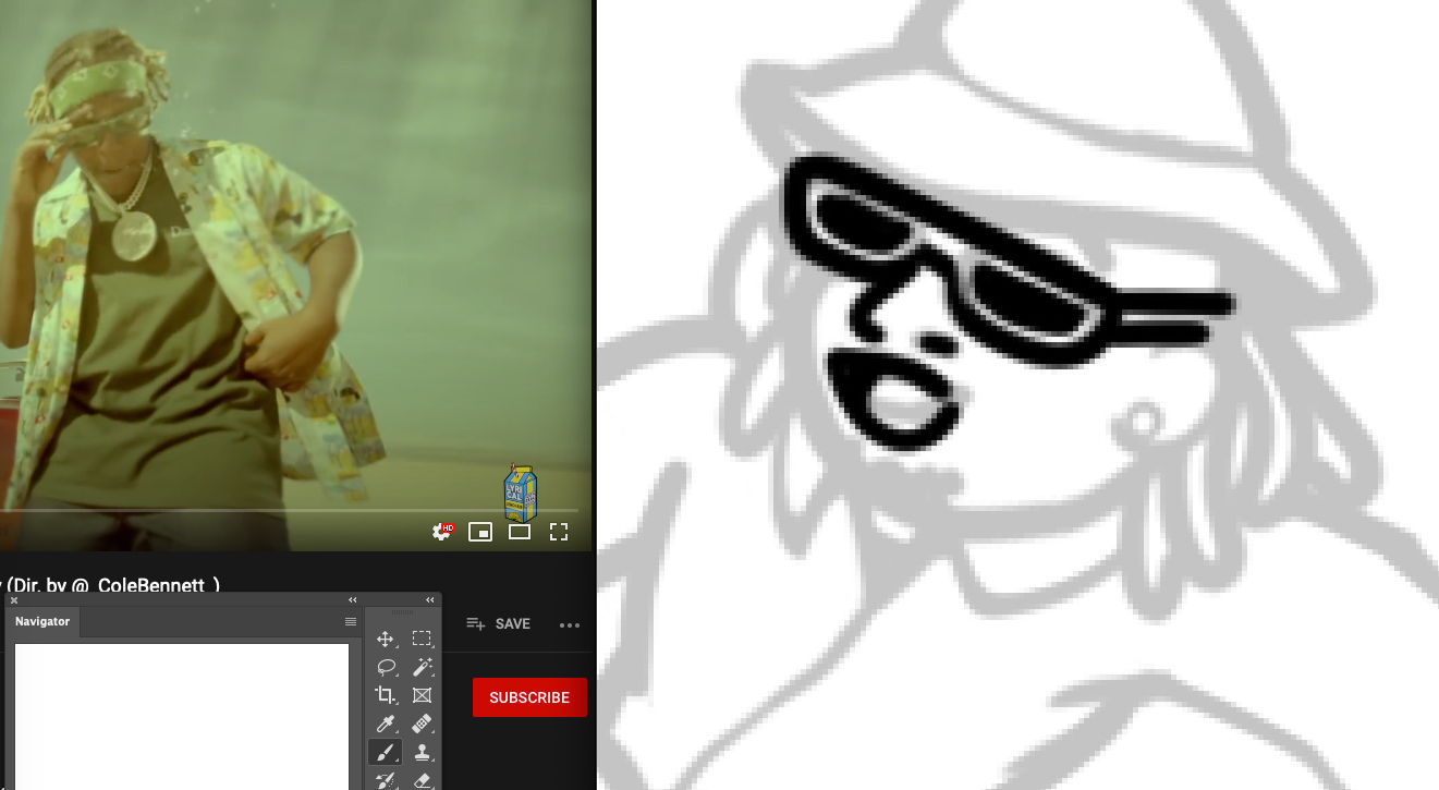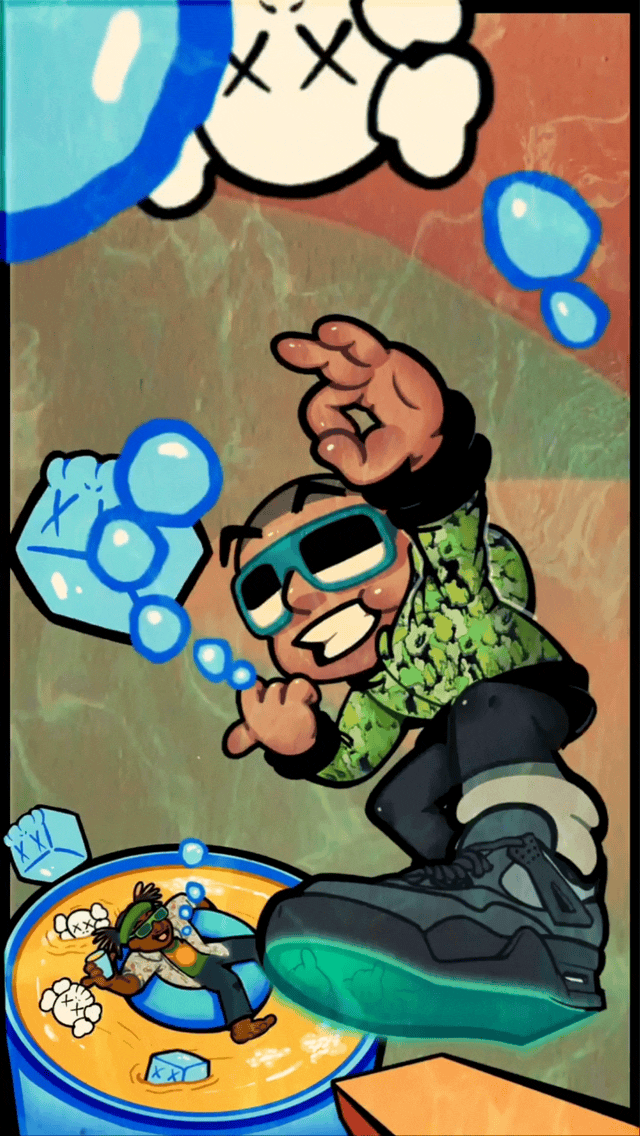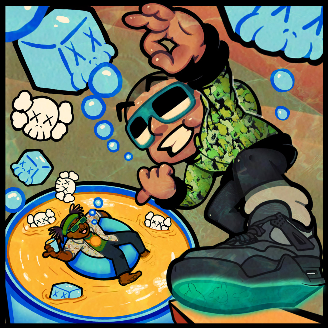 Promotional art & animation for Flash Garments. He collaborated with Don Toliver, to create a remix of Don's song, "Lemonade". Flash wanted me to draw him as a cartoon character, wearing Kaws 4 sneakers & Bape x KAWS merchandise from the 2000s. Since most of the original song takes place in the desert, I wanted to add small elements of this into the background. I thought of turning the ice cubes into KAWS faces to give the piece more personality.