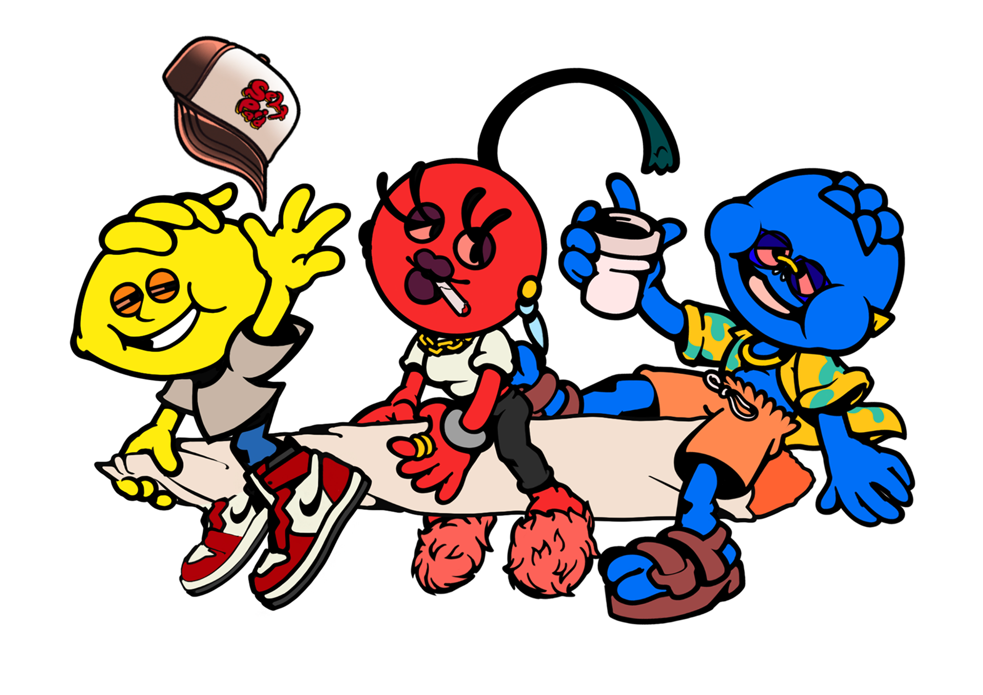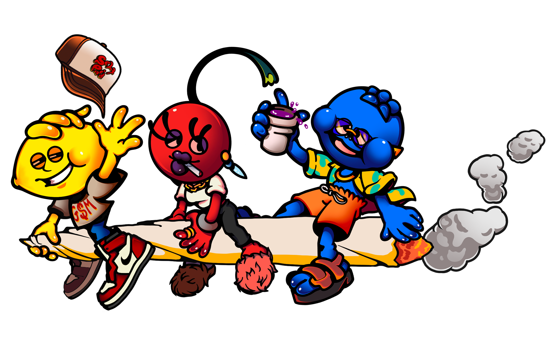 Illustration made for Pothead Exoticz product designs & apparel. Working with the example the owner showed me, I had the opportunity to draw the Pothead & Friends characters riding on a marijuana cigarette. Keeping consistent the designs previously made, the only difference this time was more saturated colors in shading.