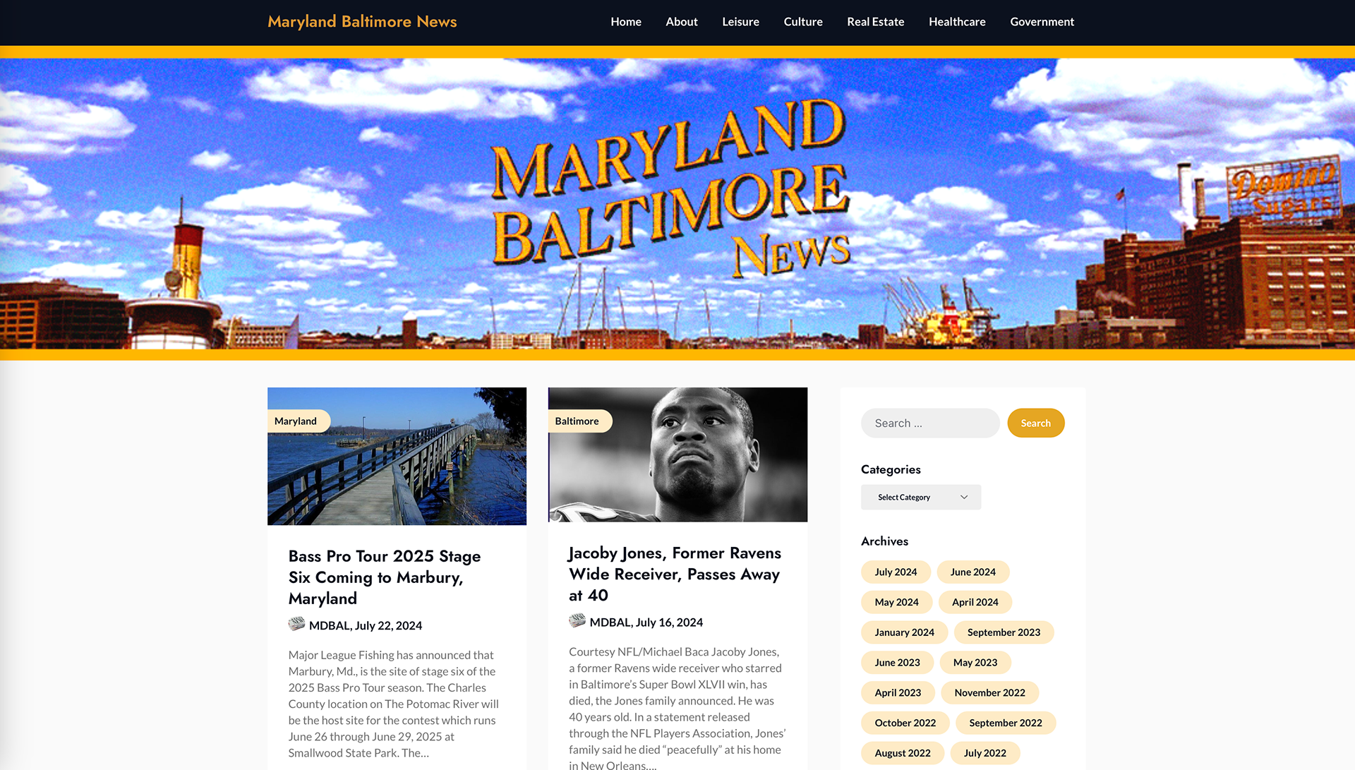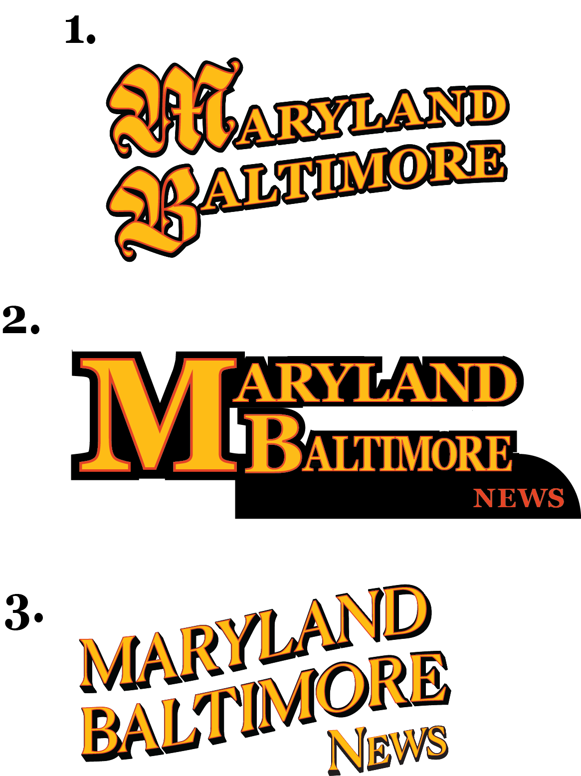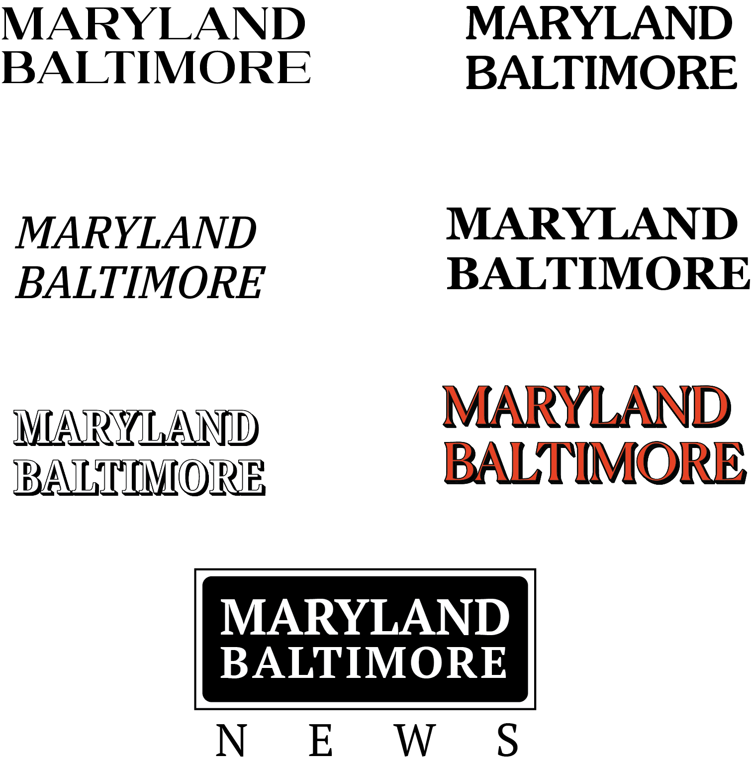 Logo design and website header for The Maryland Baltimore News, a Baltimore-based news and lifestyle website. Every visit to Baltimore evokes a mix between security and personal empowerment, every visit I find new facets of the city. It's not just a surface level sensation, it's an all-encompassing experience: the city's structure built upon generations of hard, manual labor, grit, resilience, and heat, makes its industrial heritage tangible. Baltimore's grit has been a consistent source of inspiration for my design work since my first visit, including a recent field trip to the Baltimore Museum of Industry. There, I found a typeface that inspired the logo: Baltotype, I.B.M. Executive Modern, 1957. The color palette's based on the Maryland flag and Baltimore's inner harbor.