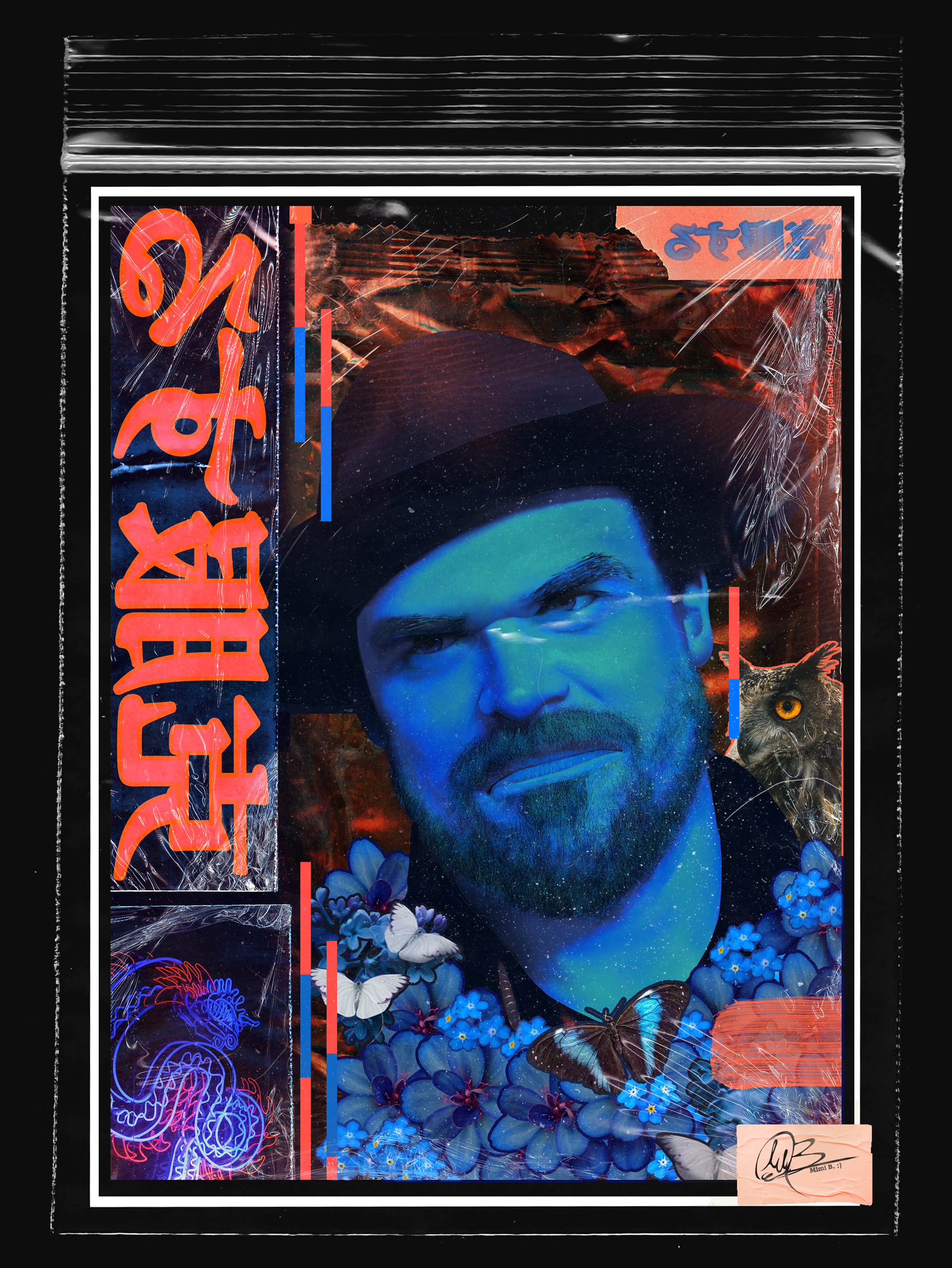 Owls live within the darkness, which includes magic, mystery, and ancient knowledge." Butterflies are included in this piece to represent change, and that once we are able to change (through understanding that change isn't painful, but resistance is) we will be able to find inner beauty, to be able to show our true selves without worriment of how others perceive us.