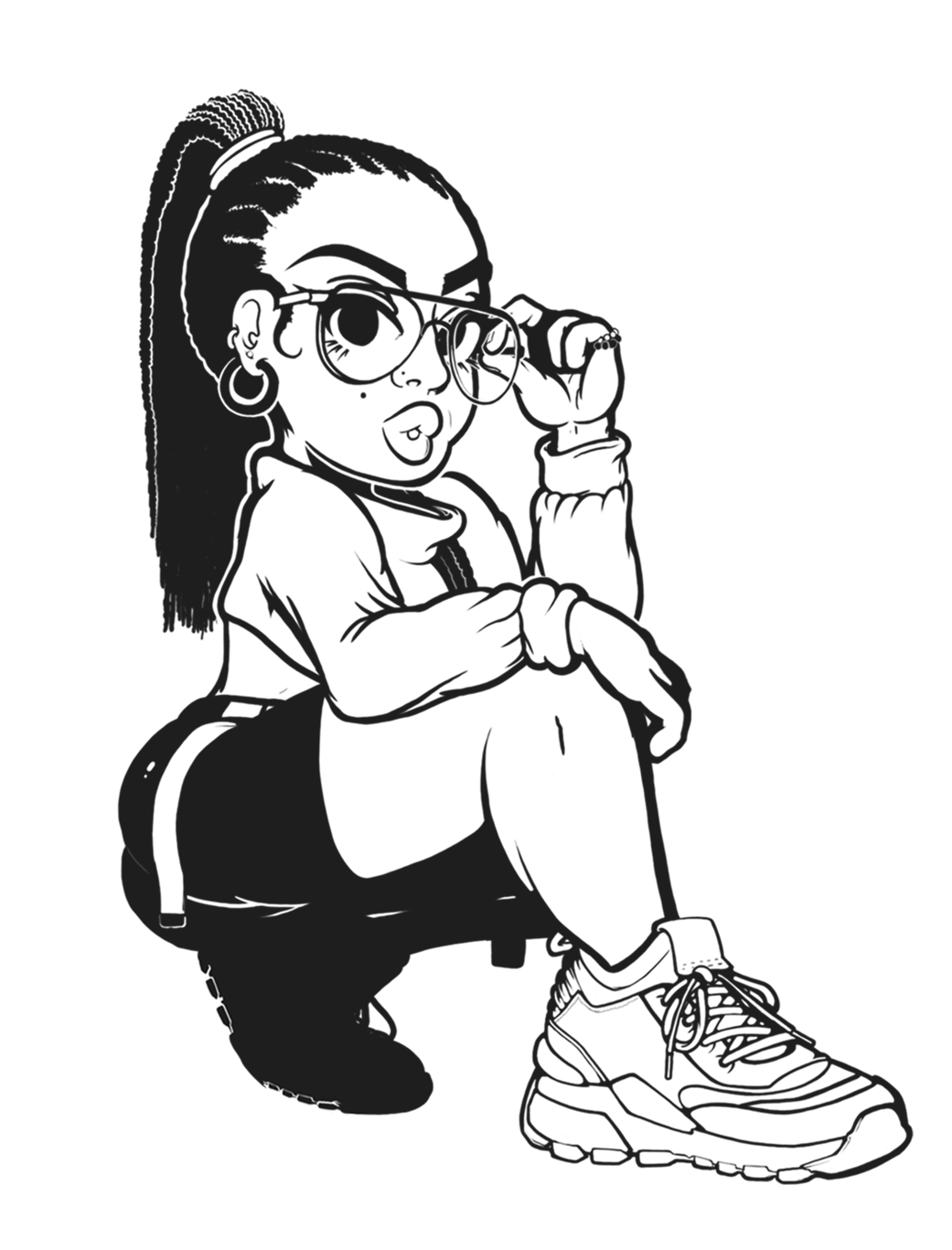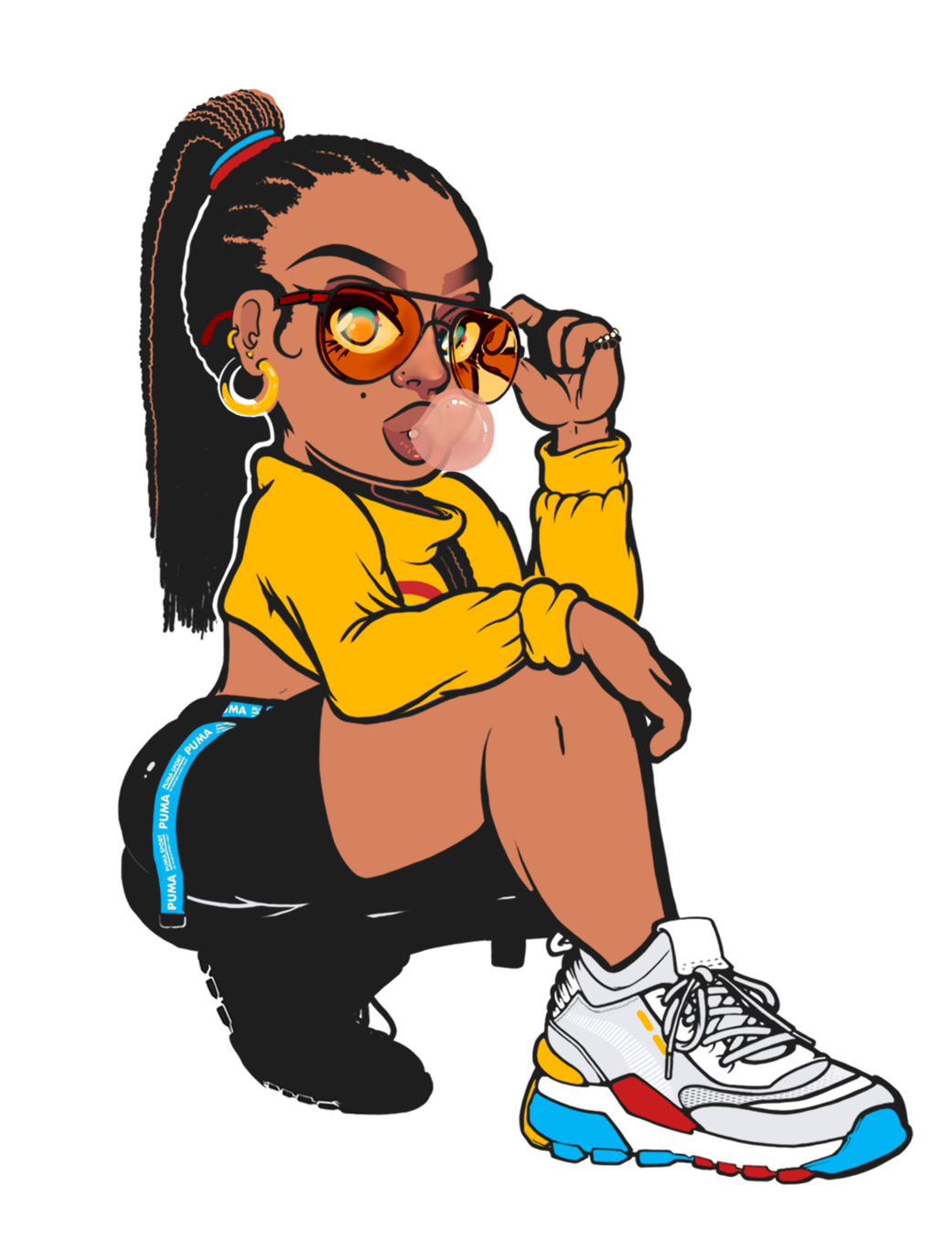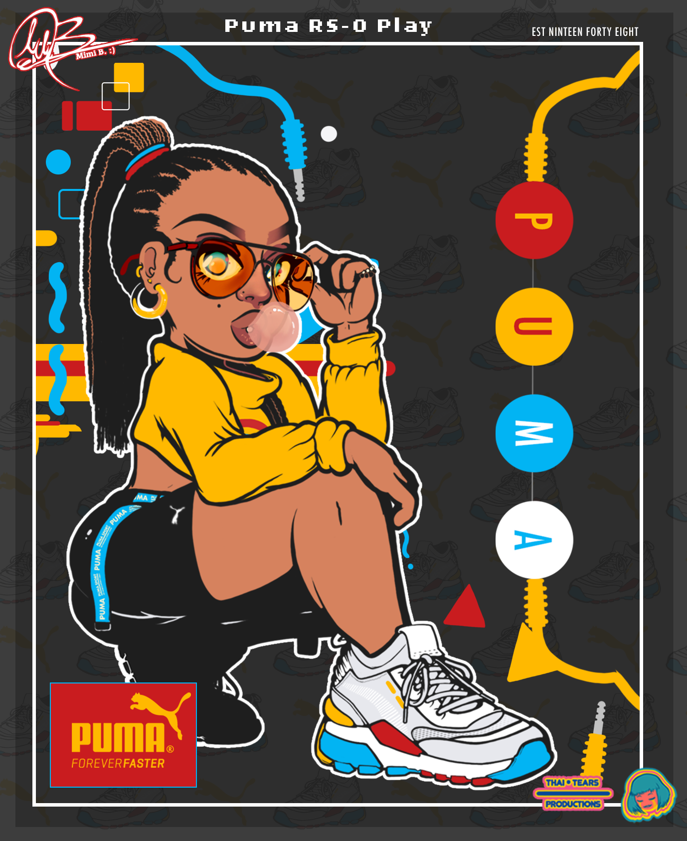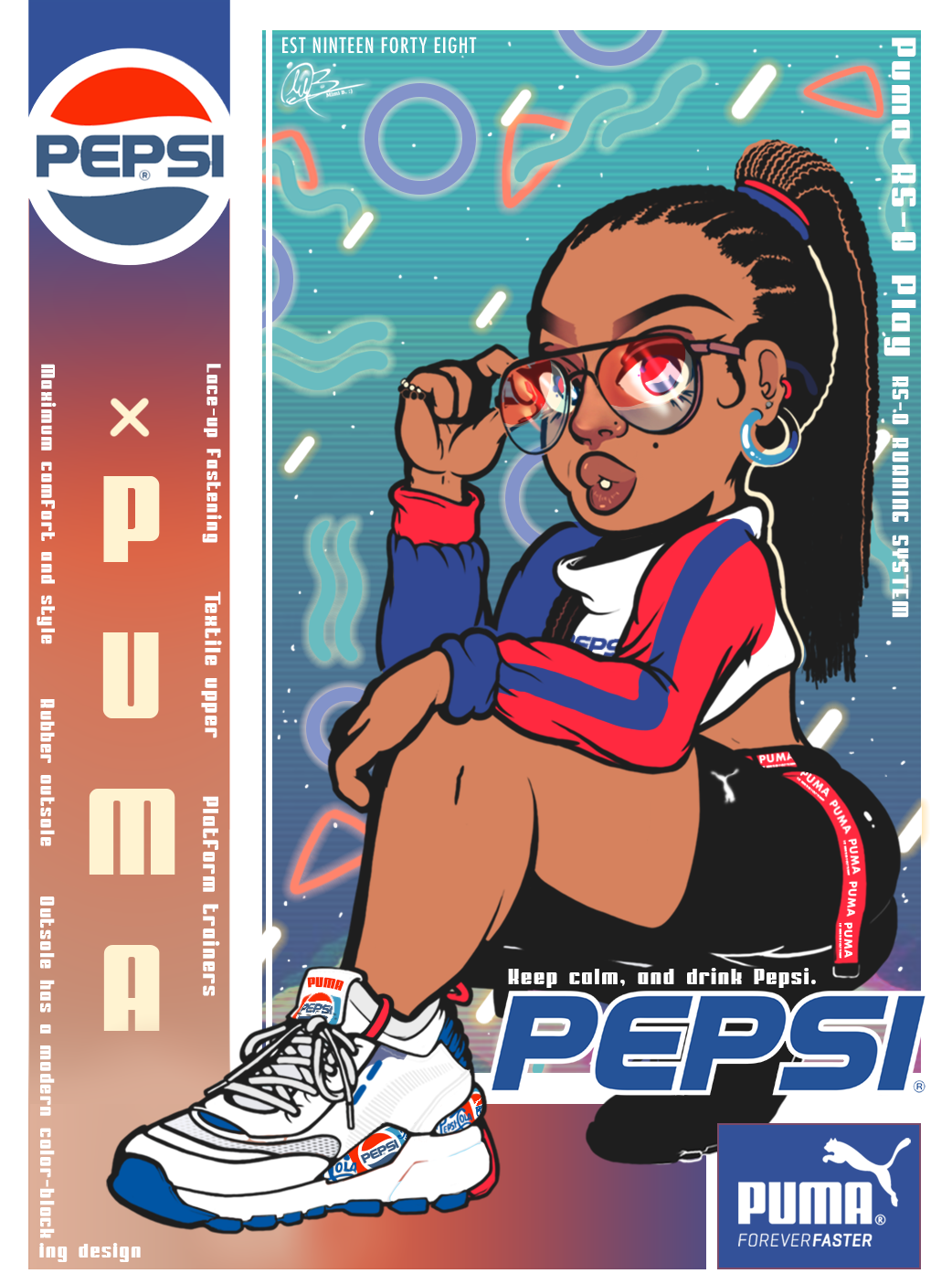 A personal drawing I made to try out some different themes and posing than my usual work. Hot squat was something that I've seen everywhere on Instagram, and wanted to try it out with something almost risqué, but showing off the main product: the shoe & its design. I decided to add another color palette to the design for this character. I found a reference for another color design for the Puma's, so I thought that aqua-green would go nicely with the color palette of that with the female character. I decided to go with a Pepsi color palette because of the simplicity in design. I enjoy the simplicity as well as the complexity of the retro aesthetic, the organized chaos in vaporware images was something that I personally enjoyed adding.