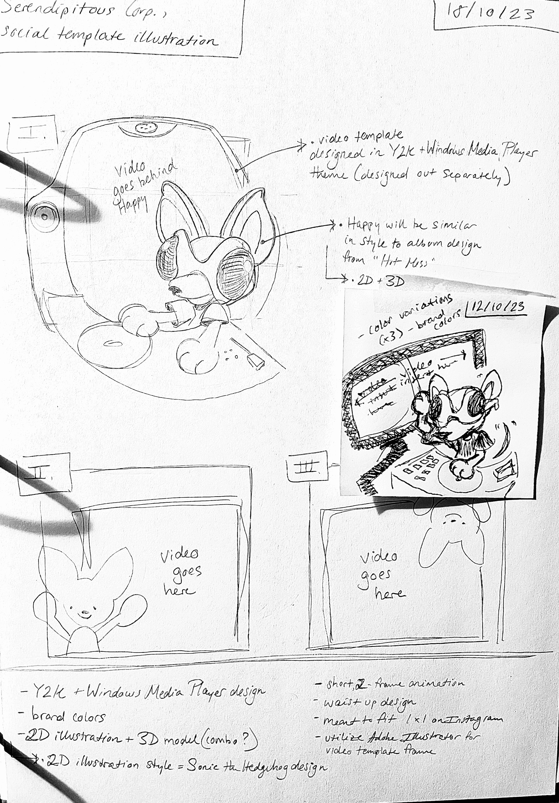 A 3D illustration and motion design commission for Serendipitous Corp.'s radio show. The main idea for the show's about introducing emerging artists and niche genres of music, such as "hyperpop." The corporation's founder and one of their head video editors explained how they're looking to incorporate their new brand identity, while featuring the emerging artists music visual/music video & a "host" for each "broadcast." I started to research famous, kind, and "guiding" characters in video games and TV shows from the late 90s-early 2000s. Designed above is Happy the Chihuahua, the animal choice was based on the founder's mother's dog, Snooki. I came up with the name "Happy" because that's what we want to feel when we hear music, everyone deserves to be happy.