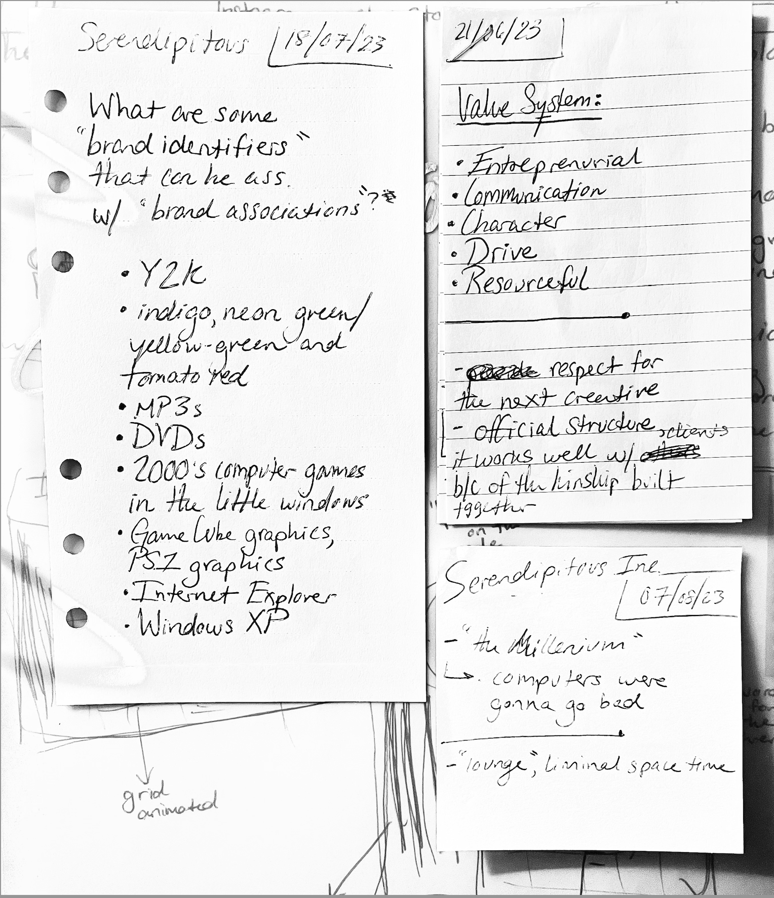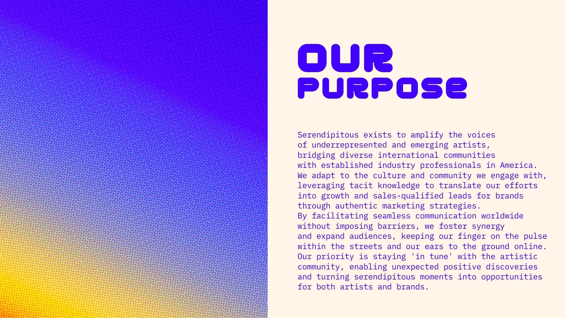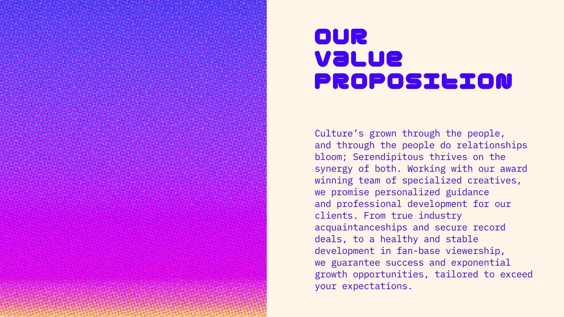 Brand strategy and Visual identity design for Serendipitous Corp., a company showcasing budding talent from all over the globe, akin to a radio station sharing new music. As the Director of Visual Development for the L.L.C., I work closely with the C.E.O. and C.F.O., having developed and consistently manage our branding and visual style guide. Reminiscent of the early 2000s and early 2010s, our visual identity's designed to create a nostalgic yet timeless design for supporters. This reflects the company's mission of connecting audiences with fresh, diverse talent from around the world, all while embodying the serendipitous nature of discovering new artists.