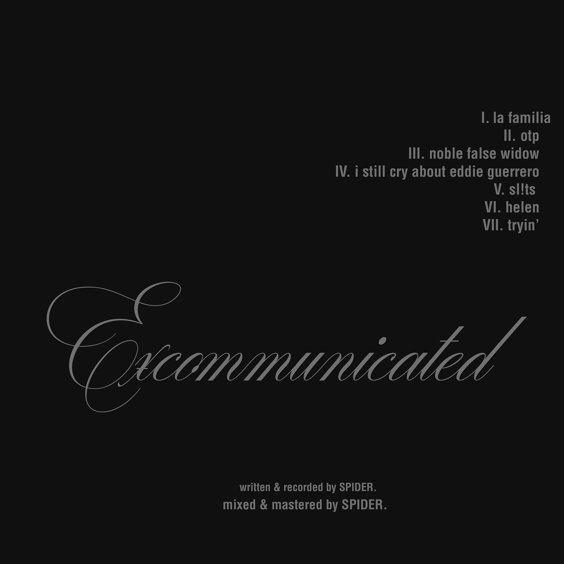 I collaborated with producer and musician Spider on the design for his debut album, "Excommunicated," which reflects his personal journey of healing from past experiences and supports those feeling disillusioned with life. Spider's music is deeply rooted in this theme, focusing on resilience and support for those trapped in dead-end jobs. He developed album concepts using AI, drawing inspiration from dark rock art, The Sopranos, and The Crow. My design proposal featured a black and white aesthetic with noise and grain for a gritty feel, along with a custom, elegant typeface reminiscent of dark lofi SoundCloud covers. Ultimately, Spider decided not to proceed with my proposal, which included a unique twist where his "Spider" logo resembled a real spider when viewed upside down, while appearing as a city skyline when right-side up.