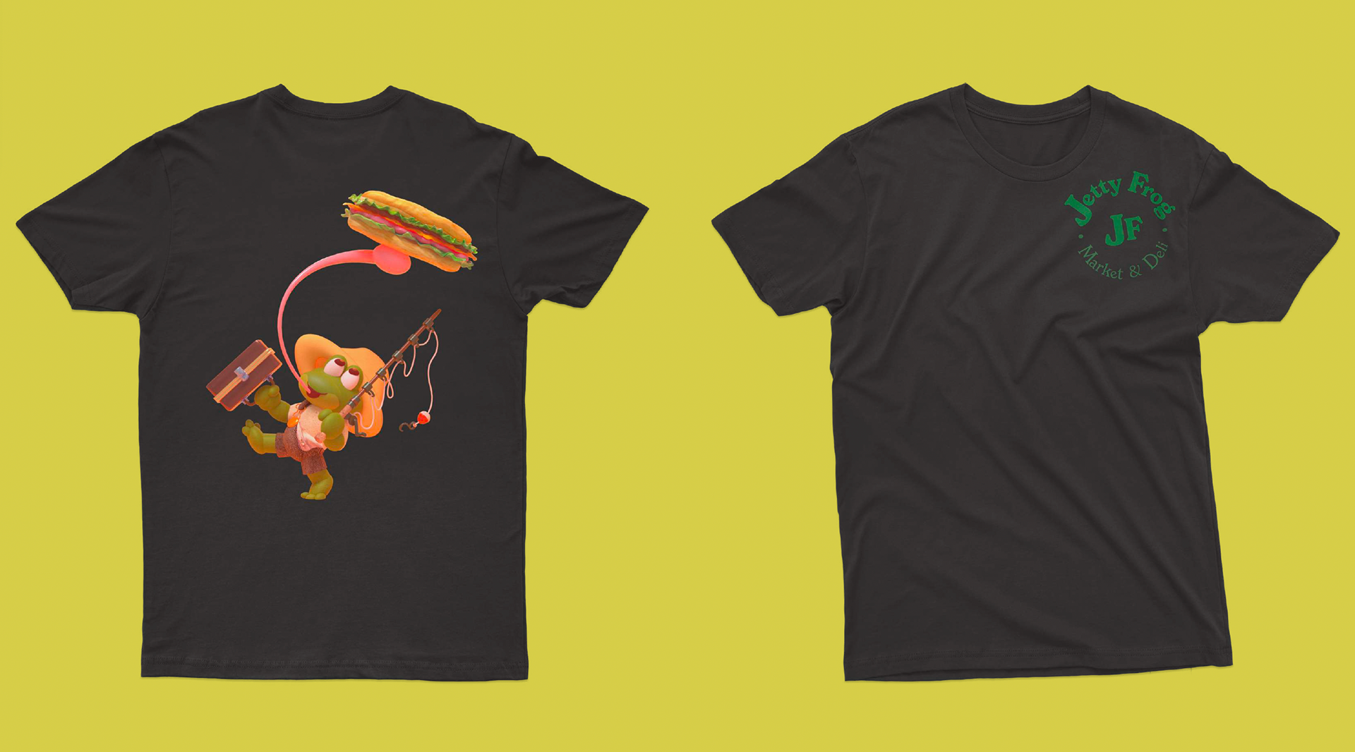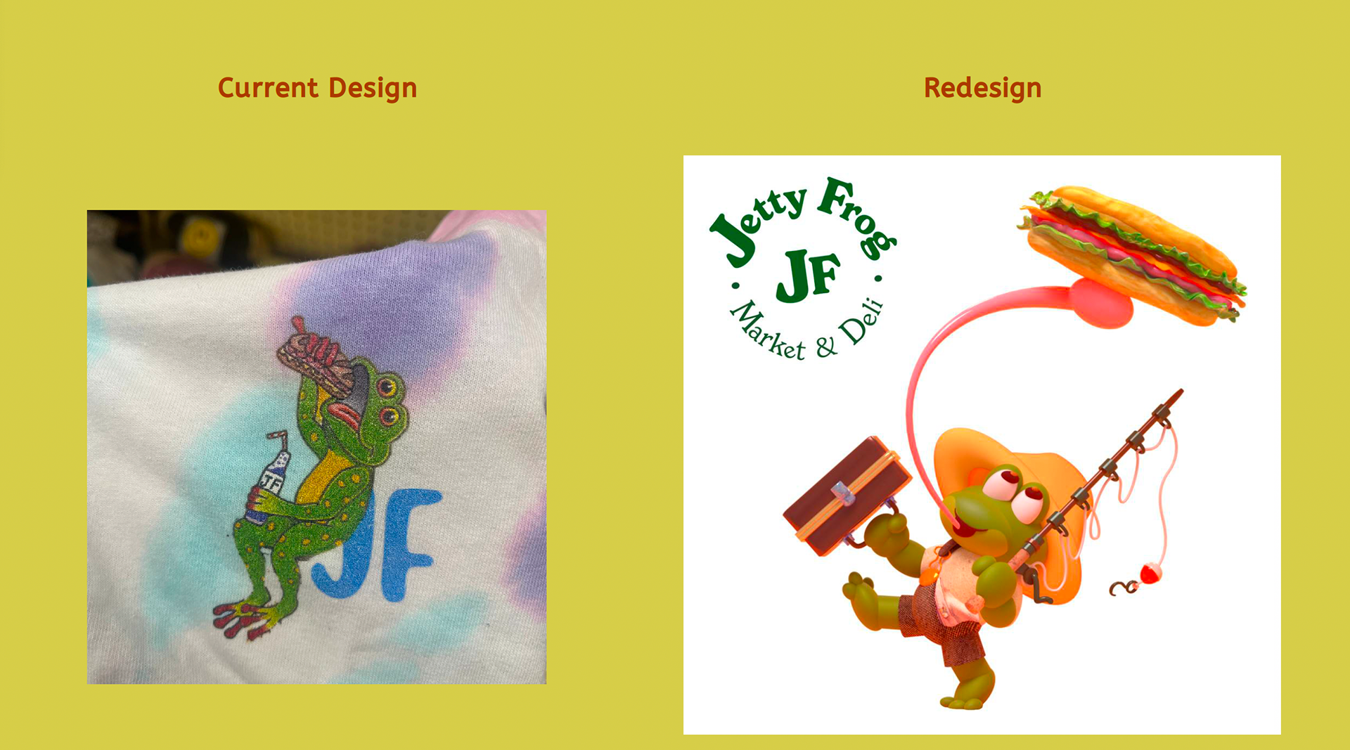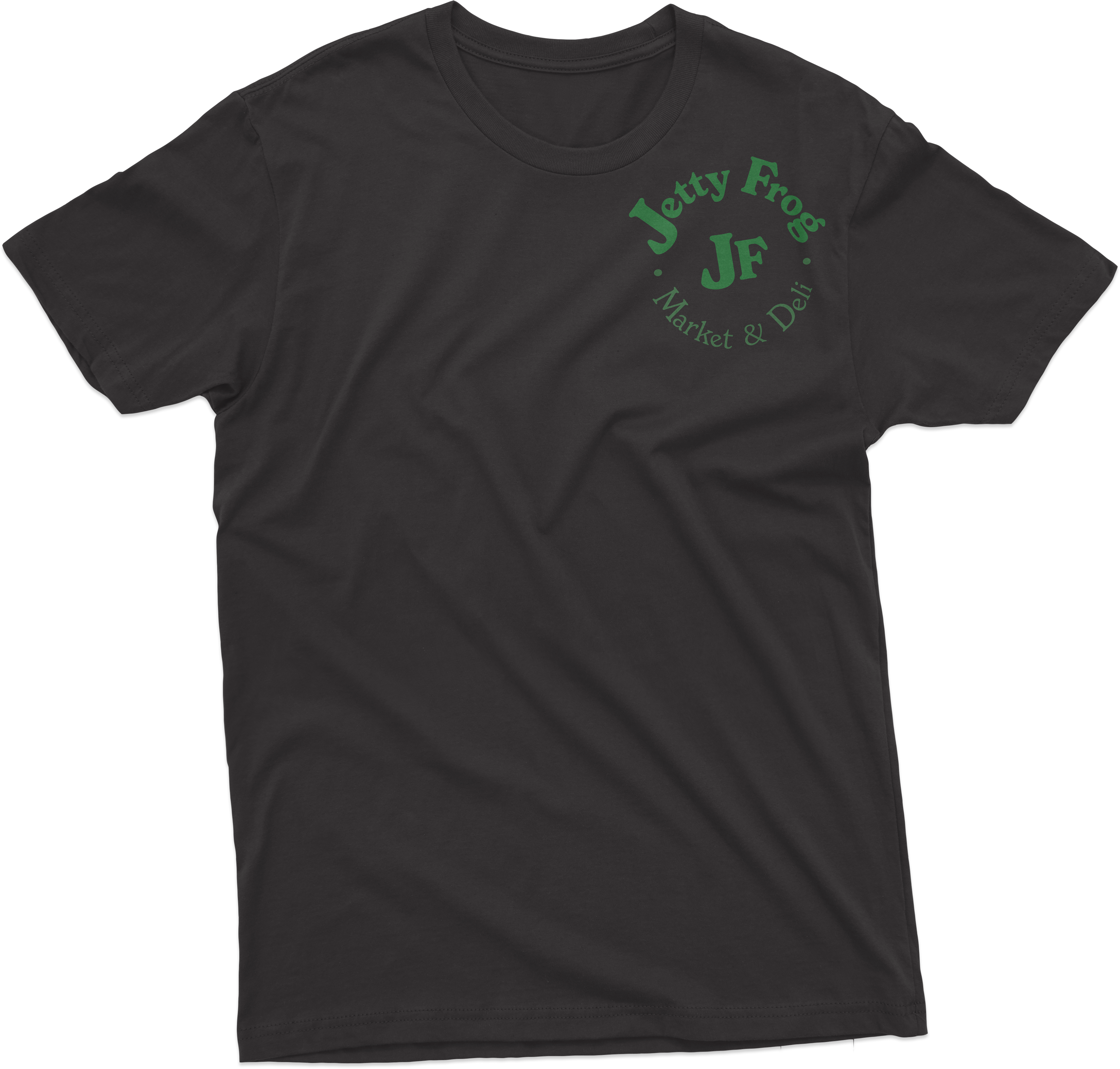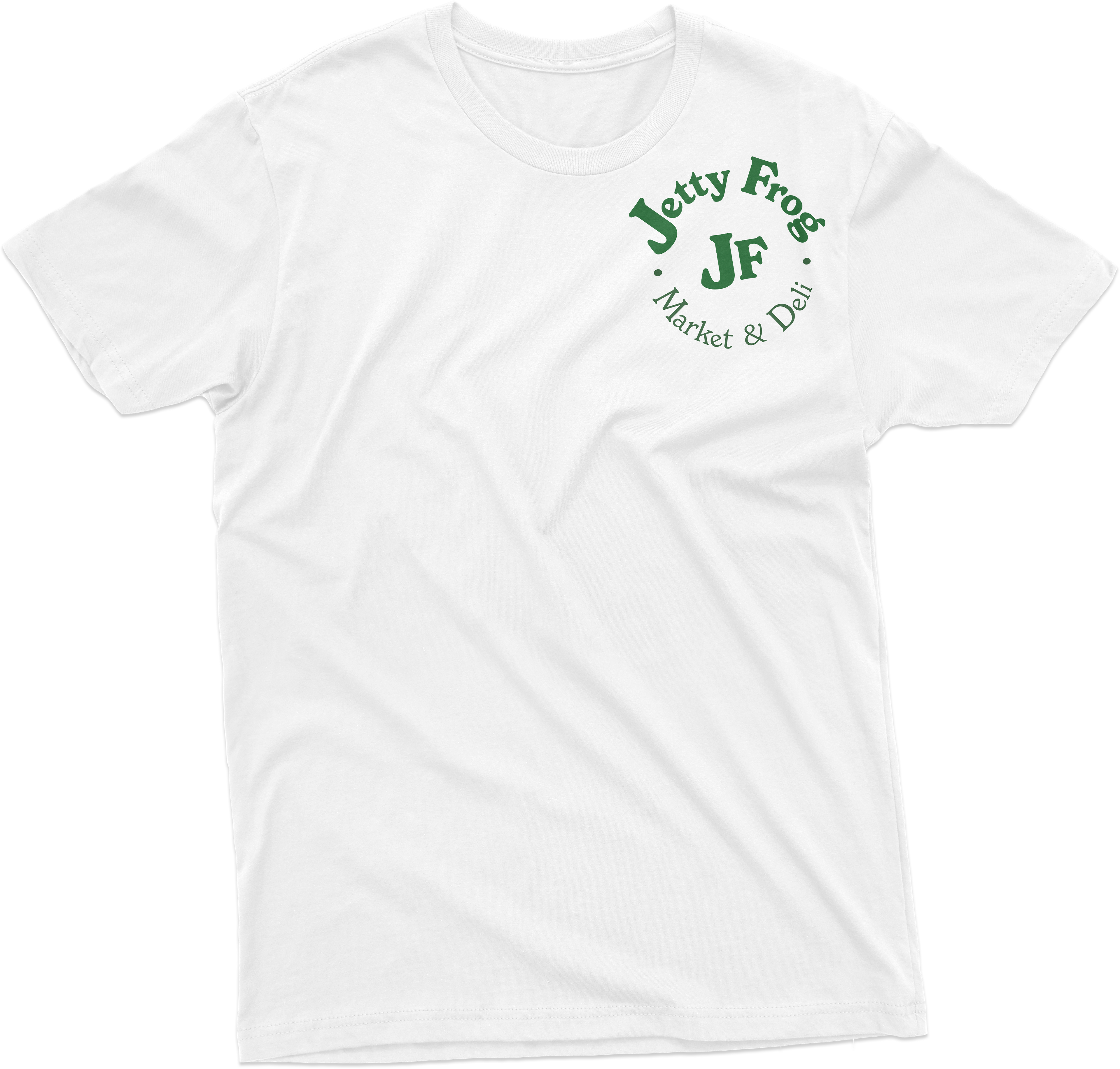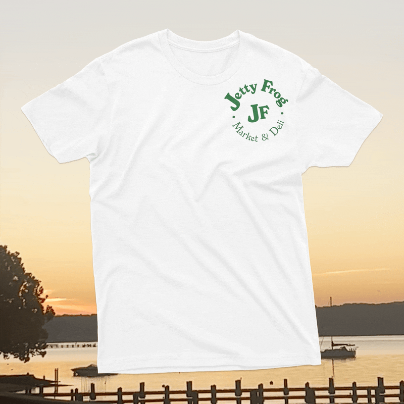 As a huge fan of The Jetty Frog, a market and deli located at 199 Old Chestnut Rd, Elkton, MD 21921, I tried to capture the essence of the establishment. I chose to redesign their t-shirt illustration and logo to better reflect the community spirit. Based on customer demographic research gathered over the last year, the design incorporates playful elements that reflect the deli's fun and friendly vibe, using a bright and engaging color scheme to emphasize freshness and quality. I chose the typeface "New Spirit" to maintain familiarity for their loyal customers. The new character, lovingly named Frankie Frog, design is inspired by the diverse clientele that frequents the market—farmers, crabbers, construction workers, and fishermen—capturing their essence in a fun and relatable way. Over the past year, I've gathered insights on customer demographics, and I'm thrilled to share these designs that resonate with the local community. The positive feedback from business associates in North East and Elkton, MD, as well as my design friends in Los Angeles and Washington, has been overwhelming. This redesign aims to celebrate the values of true grit and down-to-earth cuisine that The Jetty Frog embodies.