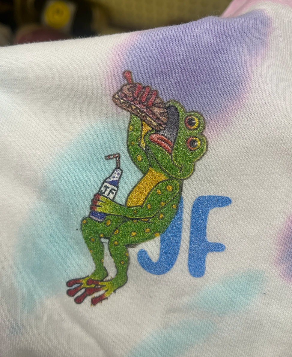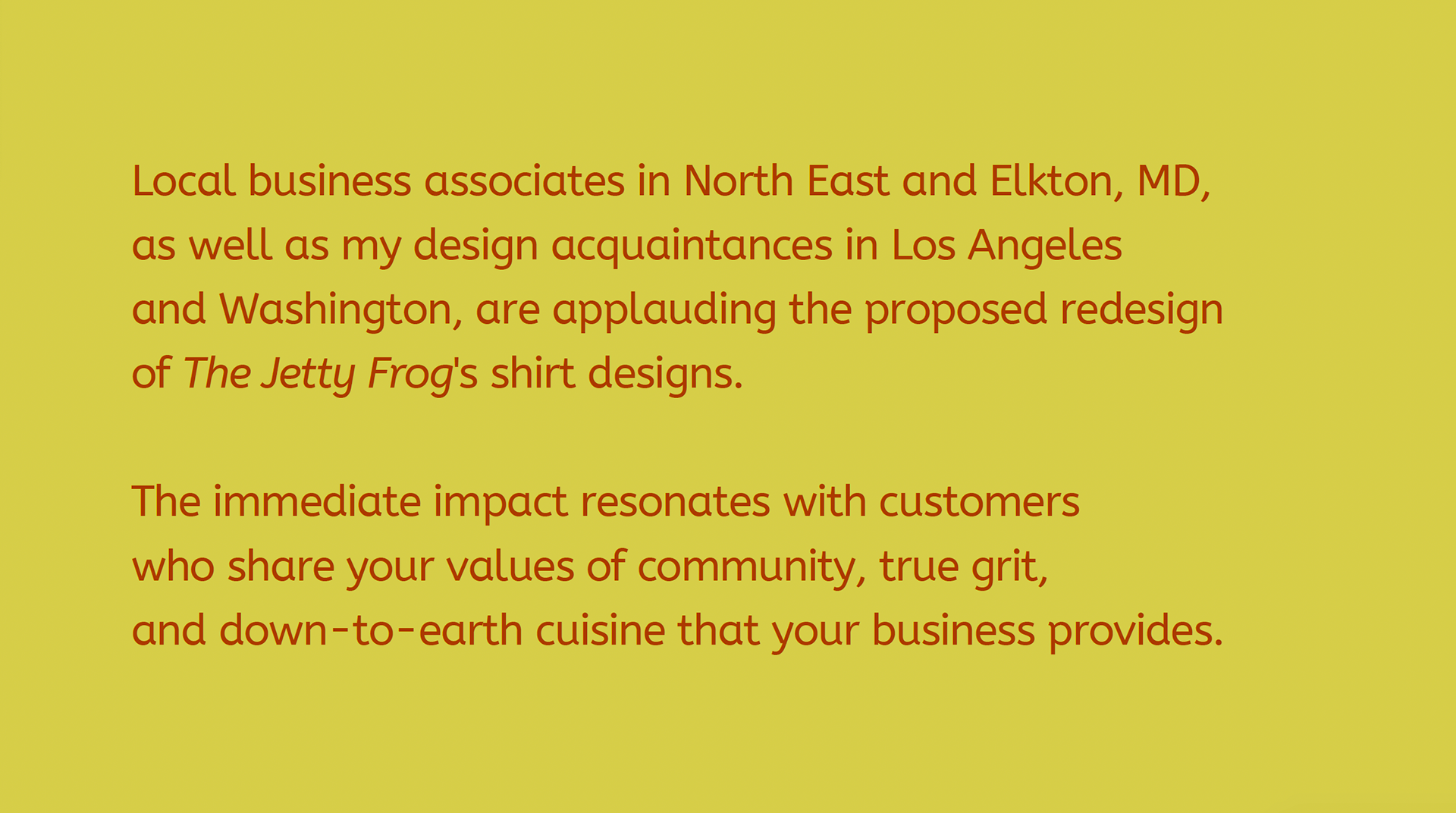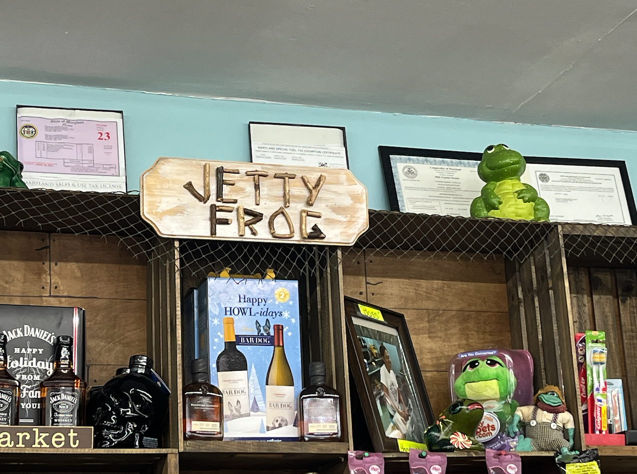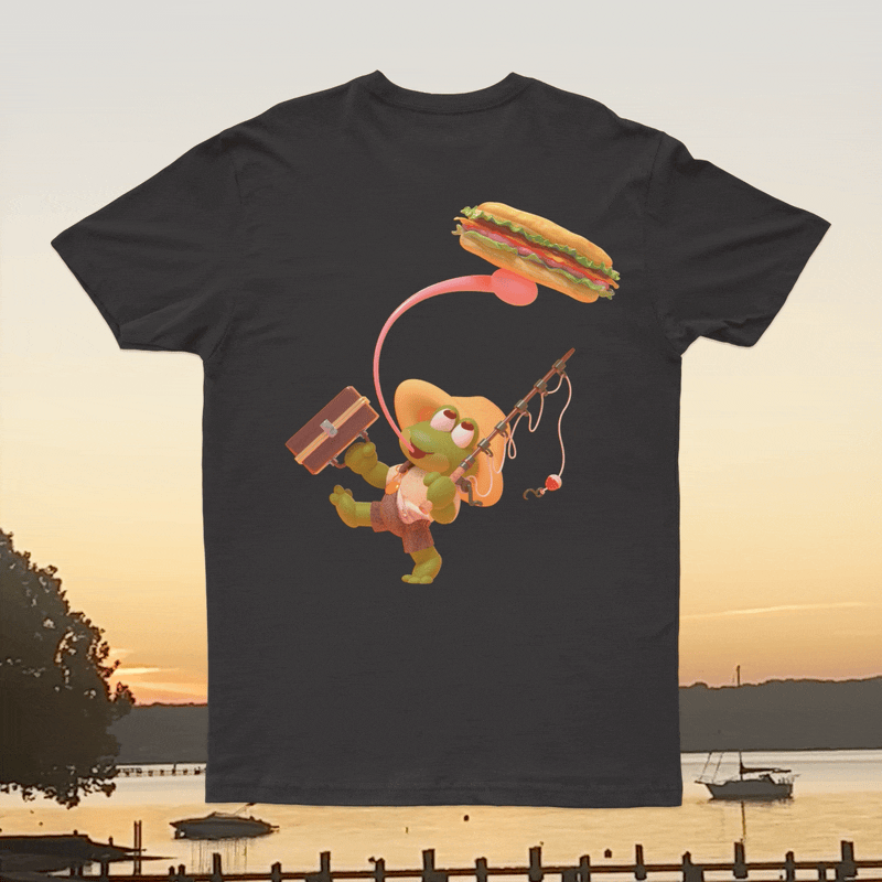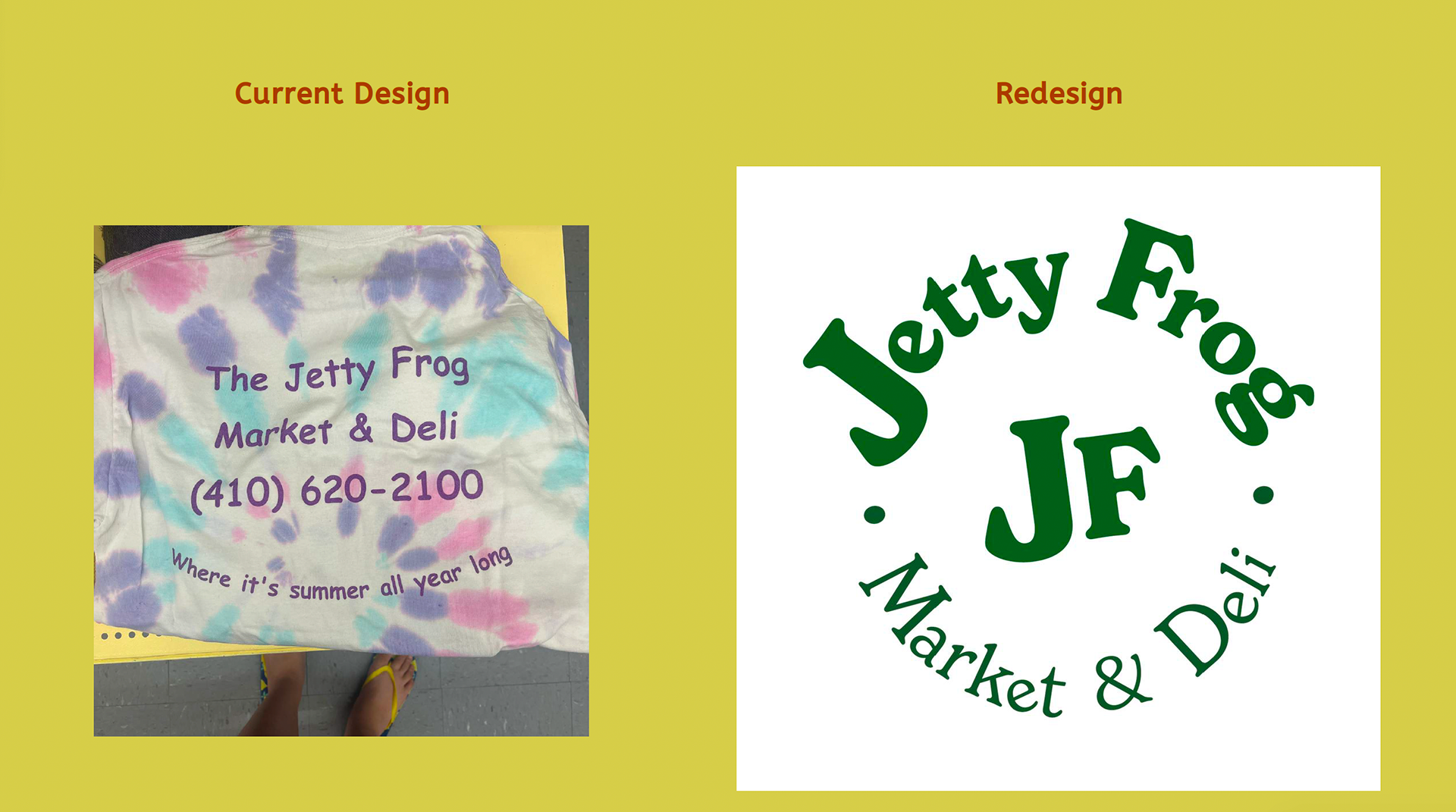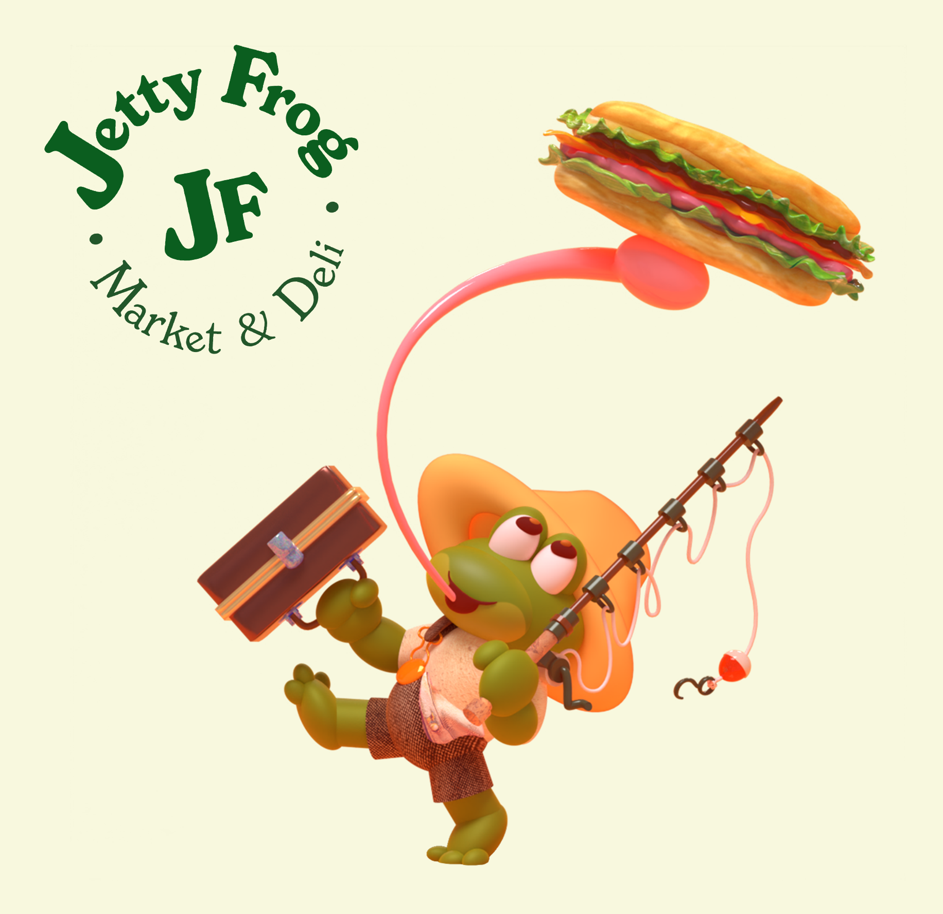 As a huge fan of The Jetty Frog, a market and deli located at 199 Old Chestnut Rd, Elkton, MD 21921, I tried to capture the essence of the establishment. I chose to redesign their t-shirt illustration and logo to better reflect the community spirit. Based on customer demographic research gathered over the last year, the design incorporates playful elements that reflect the deli's fun and friendly vibe, using a bright and engaging color scheme to emphasize freshness and quality. I chose the typeface "New Spirit" to maintain familiarity for their loyal customers. The new character, lovingly named Frankie Frog, design is inspired by the diverse clientele that frequents the market—farmers, crabbers, construction workers, and fishermen—capturing their essence in a fun and relatable way. Over the past year, I've gathered insights on customer demographics, and I'm thrilled to share these designs that resonate with the local community. The positive feedback from business associates in North East and Elkton, MD, as well as my design friends in Los Angeles and Washington, has been overwhelming. This redesign aims to celebrate the values of true grit and down-to-earth cuisine that The Jetty Frog embodies.