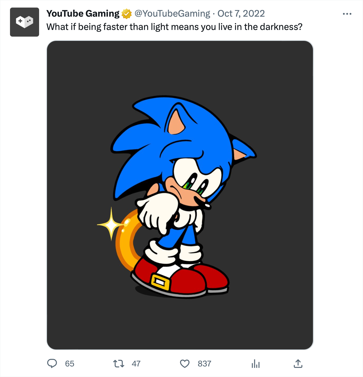 I created an illustration for YouTube Gaming that received official approval from Sega for use on YouTube's social channels. The brief from YouTube coordinators was to "depict a melancholy scene of Sonic with a defeated pose and sad expression on his face." The accompanying post copy read: "Being faster than light means you live in the darkness."