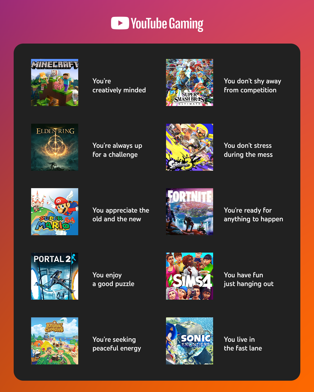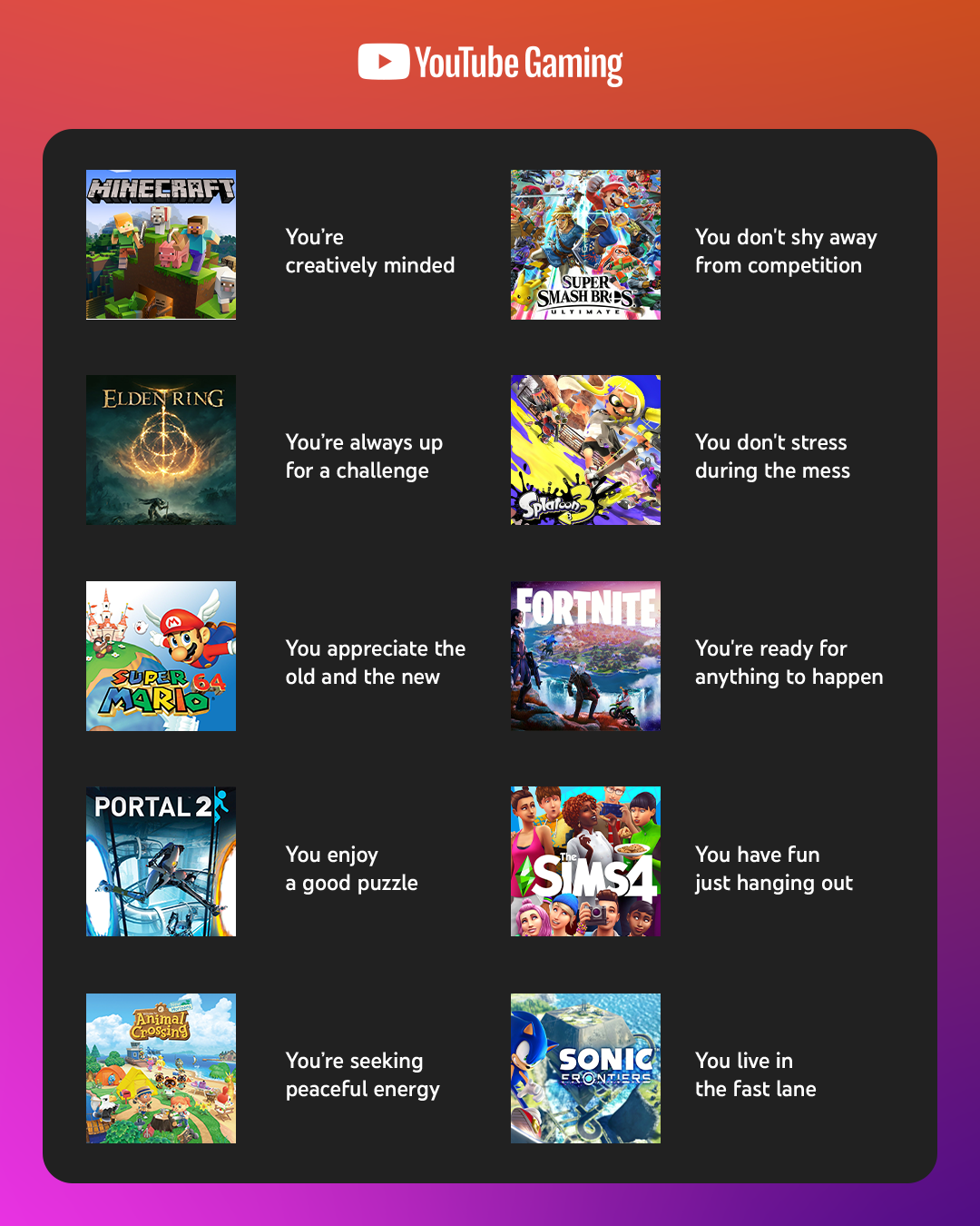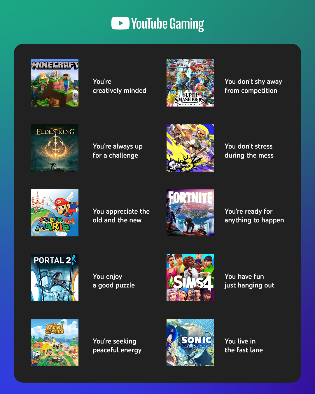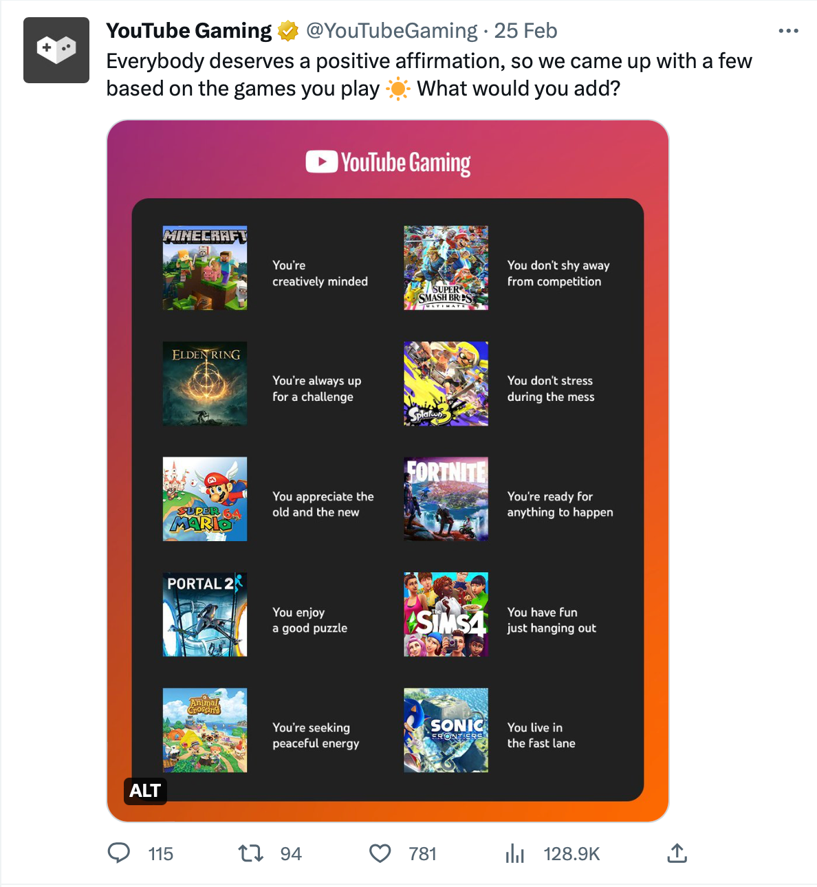 Positive affirmations correlated to game references for YouTube Gaming. Layout design and static created for the following prompt: