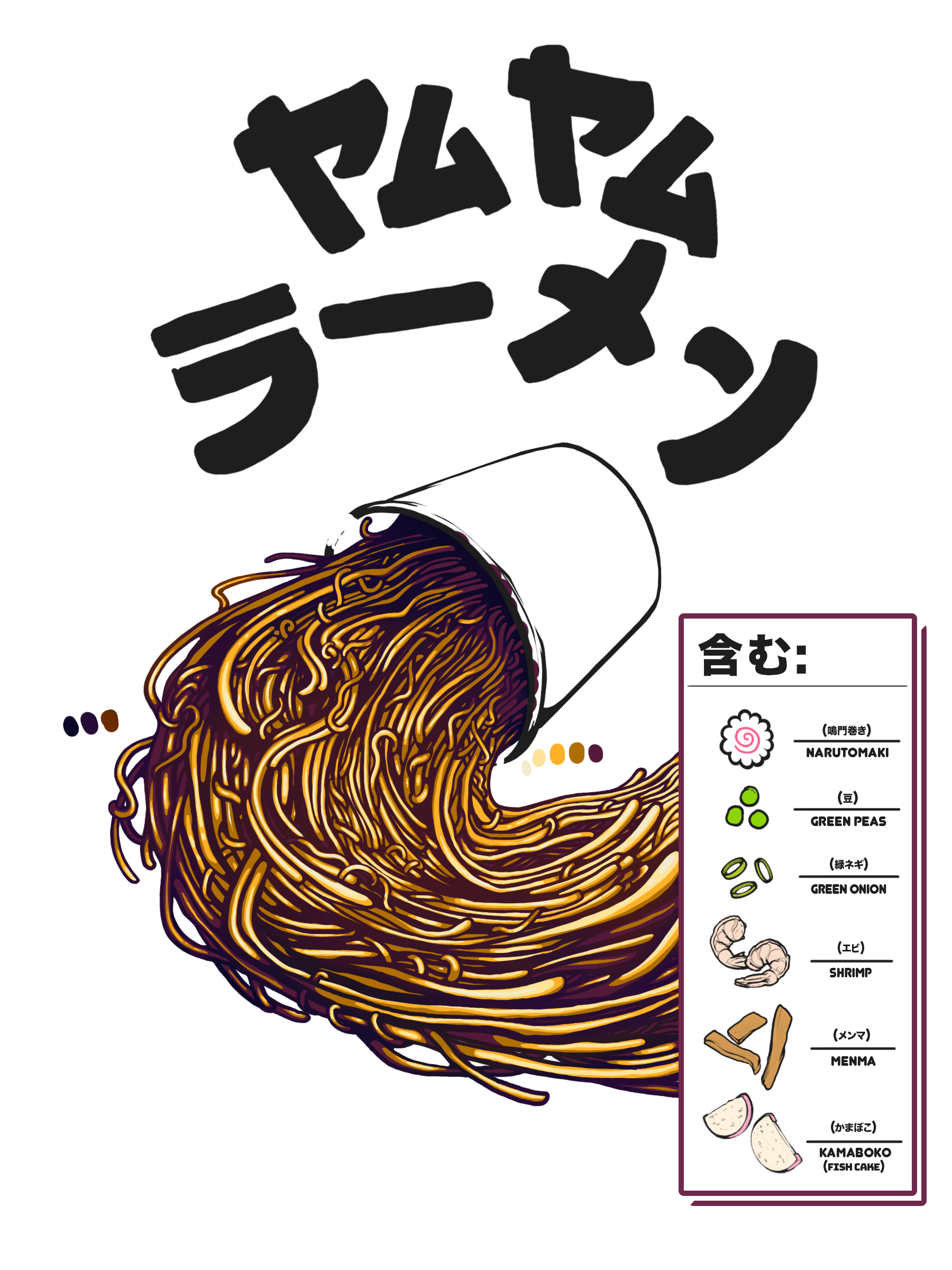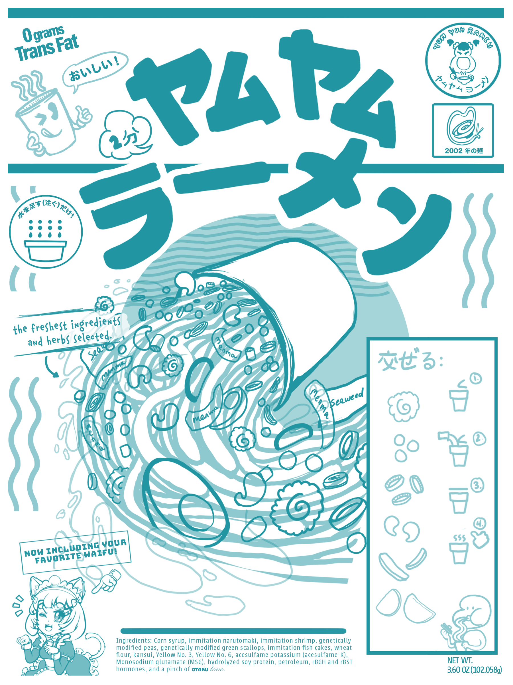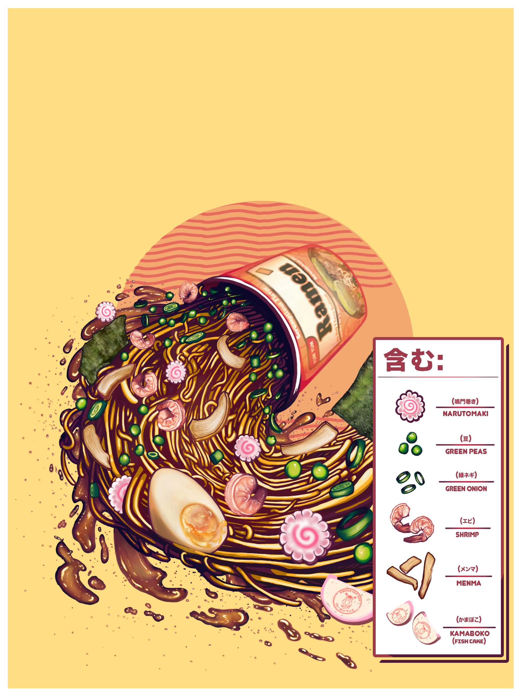 A personal project I had in my head for a while. My idea behind this poster was to parody the ramen ads we see through social media and the super market. I love ramen, I grew up on it. But, given how much sodium content is in each package (and how it's made), I made an executive decision to stop eating packaged ramen, I'm feeling sentimental about this having been one of my favorite meals as a kid. I wanted to show here that not everything is as it seems when it comes to ingredients, how they're processed through a company, promoting the idea that it's a good alternative to other meals when really it's one of the most unhealthy you could have.